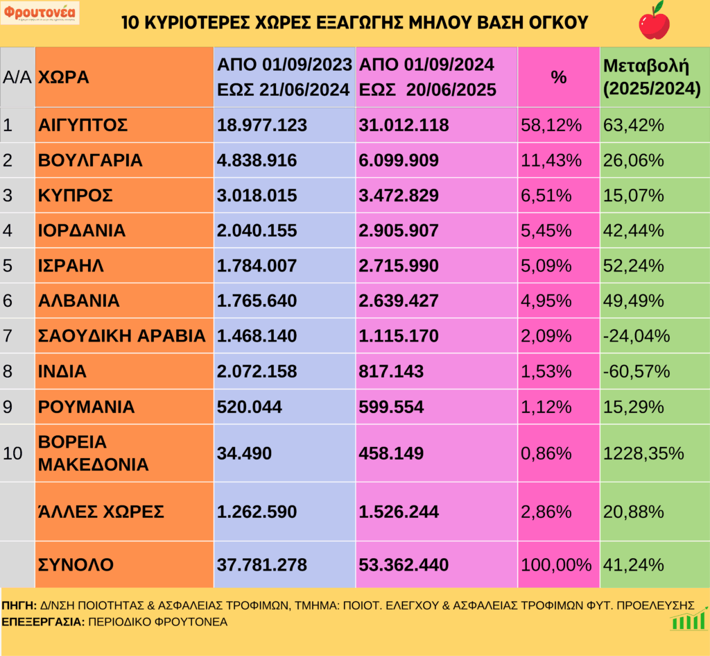 Με μεγάλη διάφορα έναντι άλλων χωρών, η Αίγυπτος απορροφά τα περισσότερα μήλα με άνοδο της τάξης του 63,42% σε σχέση με την προηγούμενη χρονιά. Υψηλά ποσοστά απορρόφησης έχει, επίσης, η Βουλγαρία, η Κύπρος και η Ιορδανία, όπως παρουσιάζεται στον πίνακα:
