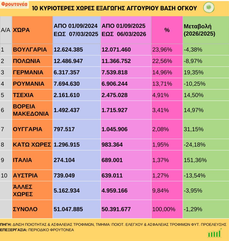 Ανακάμψη δείχνουν οι εξαγωγές αγγουριών κατά την 10η εβδομάδα του νέου έτους (6.3.26), μετά από μια περίοδο μειωμένων ποσοτήτων. Γενικότερα, σε σχέση με το περσινό αντίστοιχο διάστημα (7.3.26), οι εξαγωγές παραμένουν μειωμένες. Η κάθοδος, όπως παρουσιάζεται στον παρακάτω πίνακα αντιστοιχεί στο 1,29%.