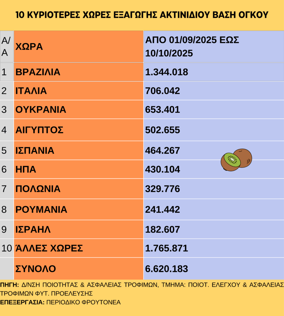 Στους 6.620.183 τόνους έχουν διαμορφωθεί από 01/09/2025 έως και 10/10/2025 οι εξαγωγές ελληνικών ακτινιδίων. Στον παρακάτω πίνακα παρουσιάζονται οι 10 κυριότερες χώρες που προορίζονται οι εξαγωγές, καθώς και o αντίστοιχος όγκος: