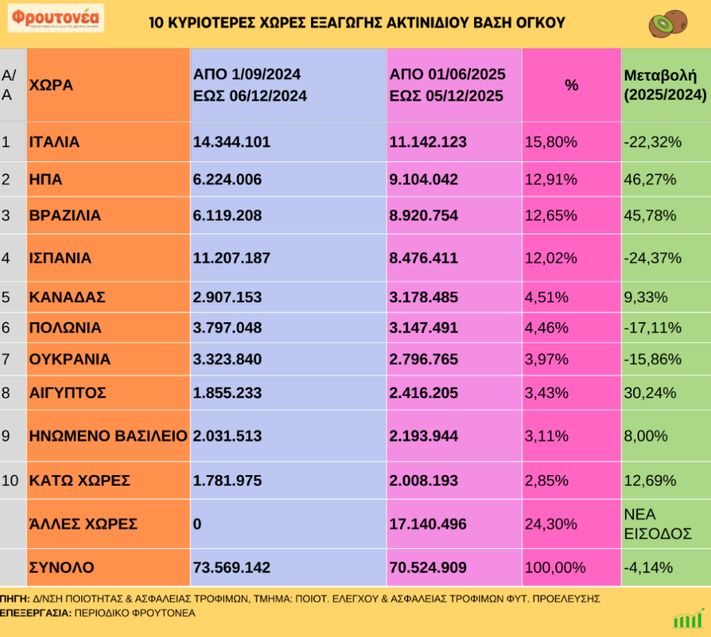 Καθοδικές κατά 4,14 % είναι οι εξαγωγές ακτινιδίων για την περίοδο 5.12.25, σε σχέση με το ίδιο χρονικό διάστημα πέρυσι. Στις κύριες χώρες εξαγωγής συγκαταλέγονται οι εξής: Βραζιλία, Ιταλία, Ισπανία, ΗΠΑ.