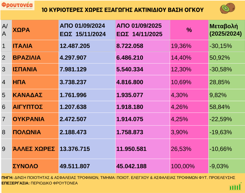 Καθοδικές κατά 9,03% είναι οι εξαγωγές ακτινιδίων για την περίοδο 14.11.2025, σε σχέση με το ίδιο χρονικό διάστημα πέρυσι. Στις κύριες χώρες εξαγωγής συγκαταλέγονται οι εξής: Βραζιλία, Ιταλία, Ισπανία, ΗΠΑ.