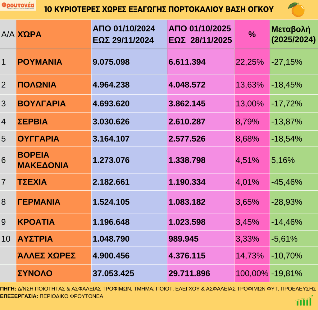 Με καθοδική πορεία συνεχίστηκαν οι εξαγωγές πορτοκαλιών έως και 28.11.25, οι οποίες είναι μειωμένες κατά 19,81% σε σχέση με την αντίστοιχη περσινή περίοδο.