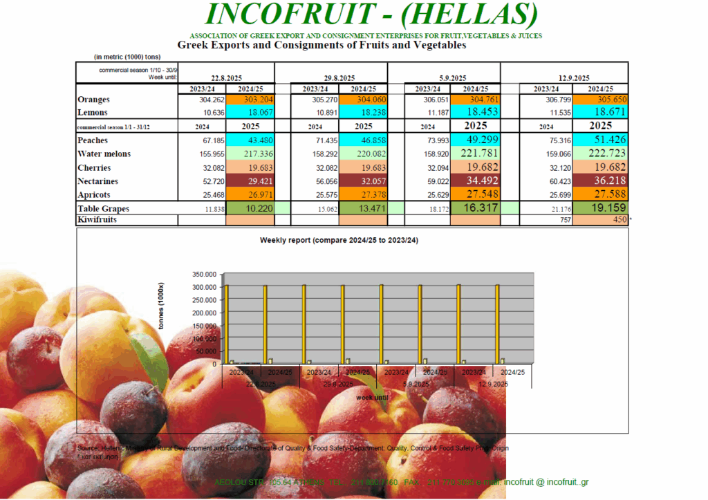 Ακολουθεί ανακοίνωση σχετικά με τις εξαγωγές νωπών οπωροκηπευτικών για τις 12.9.25 από τον ειδικό σύμβουλο της Incofruit Hellas, κ. Γιώργο Πολυχρονάκη: