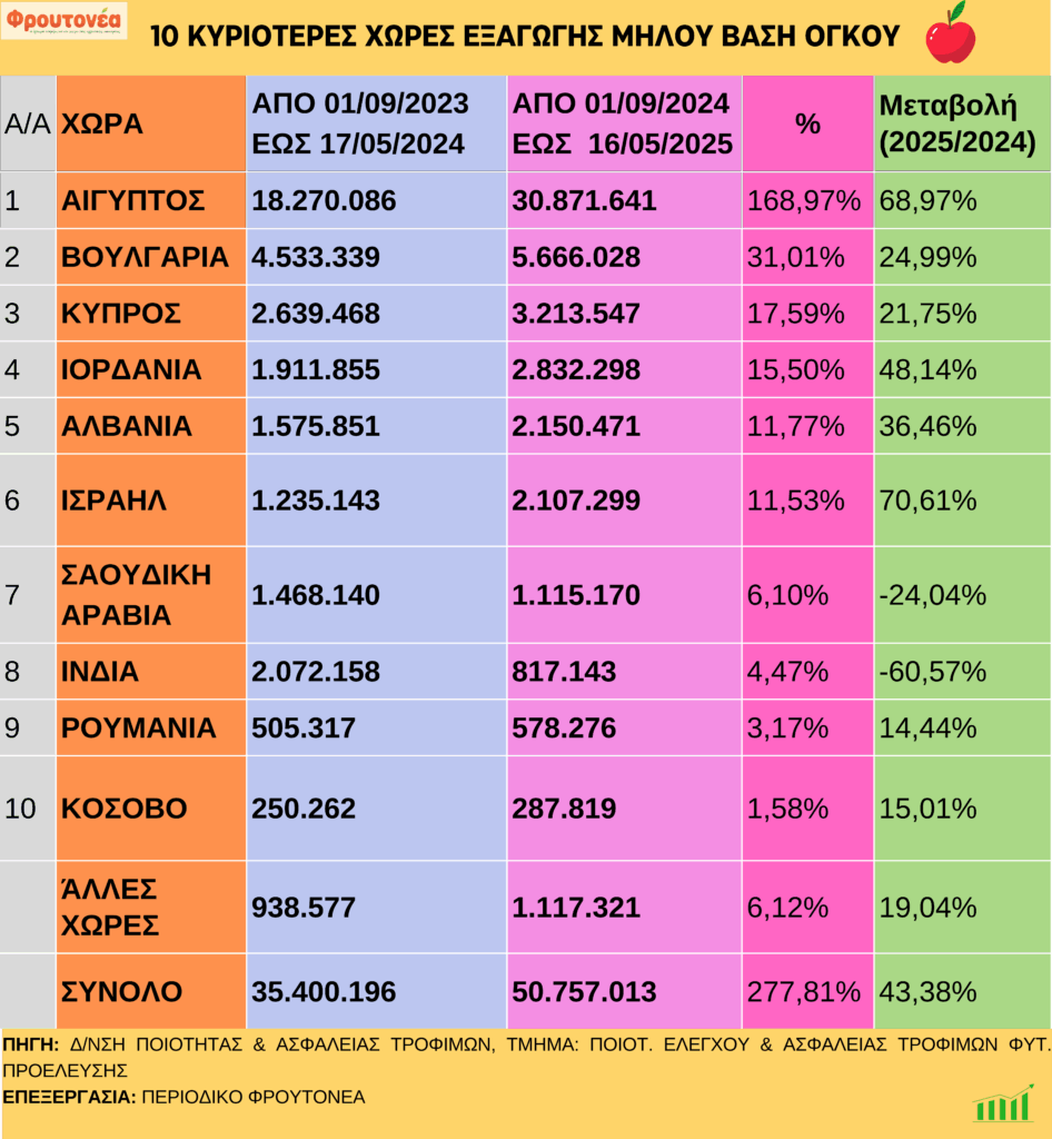 Με μεγάλη διάφορα έναντι άλλων χωρών, η Αίγυπτος απορροφά τα περισσότερα μήλα με άνοδο της τάξης του 43,38 % σε σχέση με την προηγούμενη χρονιά. Υψηλά ποσοστά απορρόφησης έχει, επίσης, η Βουλγαρία, η Κύπρος και η Ιορδανία, όπως παρουσιάζεται στον πίνακα: