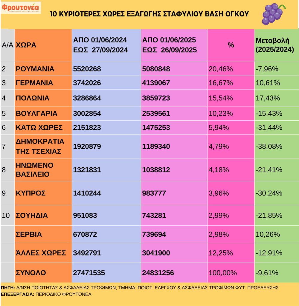 Μειωμένες είναι οι εξαγωγές έως και 26.9.25 οι εξαγωγές σταφυλιού σε σχέση με το αντίστοιχο περσινό διάστημα. Οι κύριες χώρες απορρόφησης με συντριπτικό αριθμό είναι η Πολωνία, η Γερμανία και η Ρουμανία.