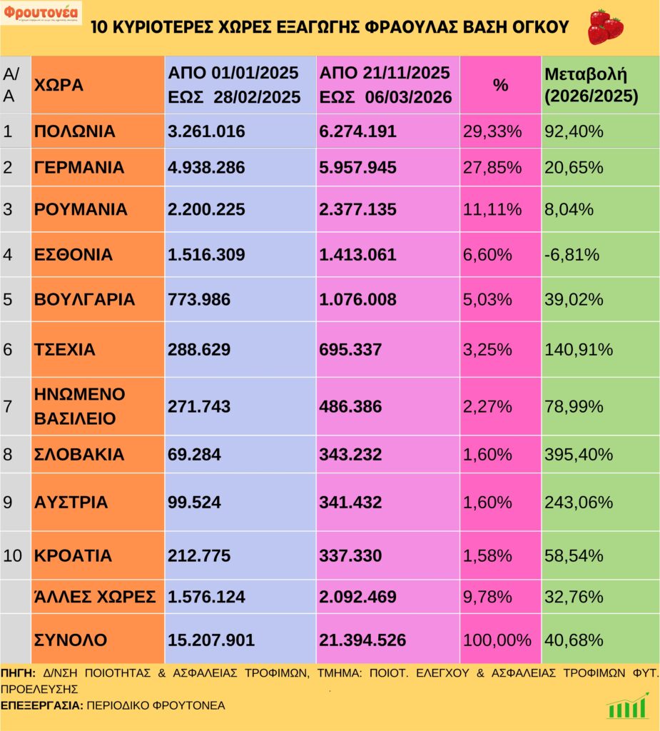 Άκρως θετική είναι η εικόνα των εξαγωγών φράουλας έως και την 10η εβδομάδα του νέου έτους, συγκριτικά με το αντίστοιχο χρονικό διάστημα πέρυσι. Όπως παρατηρείται και στον πίνακα, η φετινή χρονιά σηματοδοτεί μια αύξηση ύψους +40,68%.