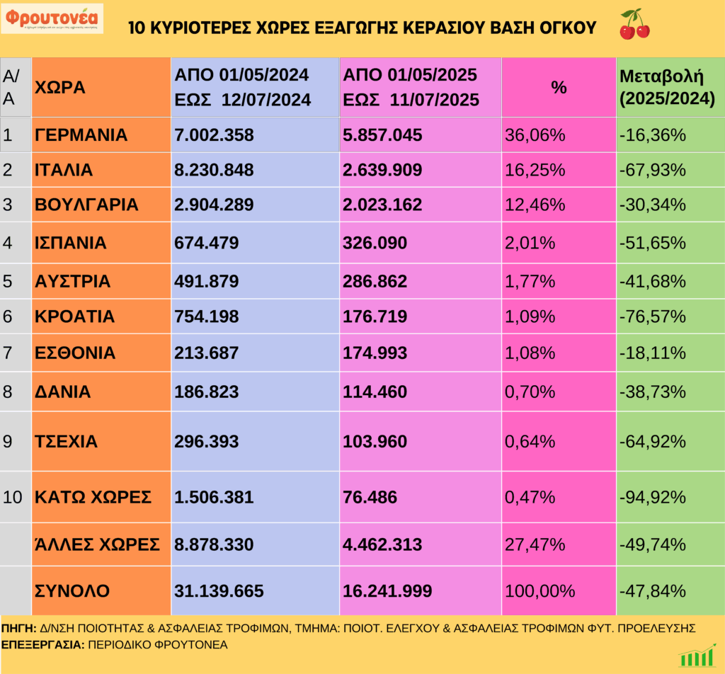 Κεράσια: Μειωμένες οι εξαγωγές έως και 11.7.25 15/07/2025 SliderΠορεία προϊόντωνΠυρηνόκαρπα FacebookTwitter Μειωμένες κατά 47,84% είναι οι εξαγωγές κερασιού έως και 11.7.25 σε σχέση με το αντίστοιχο περσινό διάστημα, όπως φαίνεται στον πίνακα: Tags:ΕξαγωγεςΚΕΡΑΣΙΑ μερίδιο FacebookTwitter Διαβάστε επίσης ΥΠΑΑΤ: Πάνω από 1.800 έλεγχοι ενόψει Πάσχα για την αποτροπή ελληνοποιήσεων ΑΑΔΕ: Πληρωμές 202 εκατ. ευρώ για βασική και συνδεδεμένη ενίσχυση Συνεργασία Yara Ελλάς & Κτήμα Κυρ Γιάννη: Ένα καινοτόμο Living Lab για την υγεία του εδάφους Αμπέλι: Τεχνικό δελτίο φυτοπροστασίας για Ηράκλειο Κρήτης Dulcis: Δυναμική άνοδος για το premium πράσινο ακτινίδιο στην ευρωπαϊκή αγορά Μειωμένες κατά 47,84% είναι οι εξαγωγές κερασιού έως και 11.7.25 σε σχέση με το αντίστοιχο περσινό διάστημα, όπως φαίνεται στον πίνακα: Tags:ΕξαγωγεςΚΕΡΑΣΙΑ μερίδιο FacebookTwitter Διαβάστε επίσης ΥΠΑΑΤ: Πάνω από 1.800 έλεγχοι ενόψει Πάσχα για την αποτροπή ελληνοποιήσεων ΑΑΔΕ: Πληρωμές 202 εκατ. ευρώ για βασική και συνδεδεμένη ενίσχυση Συνεργασία Yara Ελλάς & Κτήμα Κυρ Γιάννη: Ένα καινοτόμο Living Lab για την υγεία του εδάφους Αμπέλι: Τεχνικό δελτίο φυτοπροστασίας για Ηράκλειο Κρήτης Dulcis: Δυναμική άνοδος για το premium πράσινο ακτινίδιο στην ευρωπαϊκή αγορά Προηγούμενο άρθροIσχυρό πλήγμα στις εξαγωγές ελληνικής κομπόστας από τον TραμπΕπόμενο άρθροΝεκταρίνι: Μειωμένες οι εξαγωγές έως και 11.7.25 Σχετικά Άρθρα ΥΠΑΑΤ: Πάνω από 1.800 έλεγχοι ενόψει Πάσχα για την αποτροπή ελληνοποιήσεων ΑΑΔΕ: Πληρωμές 202 εκατ. ευρώ για βασική και συνδεδεμένη ενίσχυση Συνεργασία Yara Ελλάς & Κτήμα Κυρ Γιάννη: Ένα καινοτόμο Living Lab για την υγεία του εδάφους Αμπέλι: Τεχνικό δελτίο φυτοπροστασίας για Ηράκλειο Κρήτης