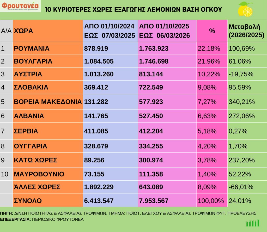 Με αμετάβλητο ρυθμό συνεχίστηκαν οι εξαγωγές λεμονιών κατά την 10η εβδομάδα της τρέχουσας χρονιάς, εμφανίζοντας ενισχυμένα μεγέθη σε σχέση με το ίδιο περσινό διάστημα. Ο όγκος των εξαγωγών ανήλθε στους  7.953.567 τόνους μέχρι και τις 6.3.26, έναντι των 6.413.547 τόνων που είχαν καταγραφεί έως τις 7.3.26, σημειώνοντας άνοδο της τάξης του 24,01%.