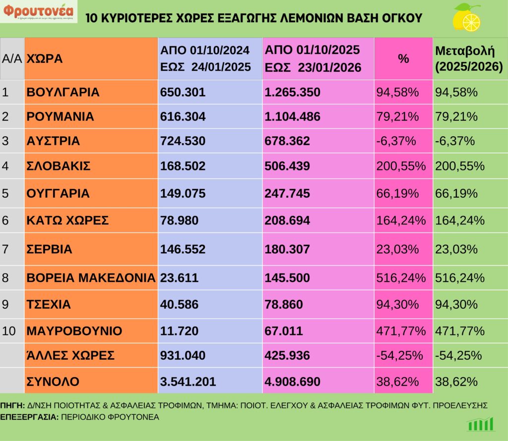 Παρακάτω ακολουθεί ο πίνακας με τις 10 κυριότερες χώρες εξαγωγής λεμονιού βάση όγκου για τις 23.1.26: