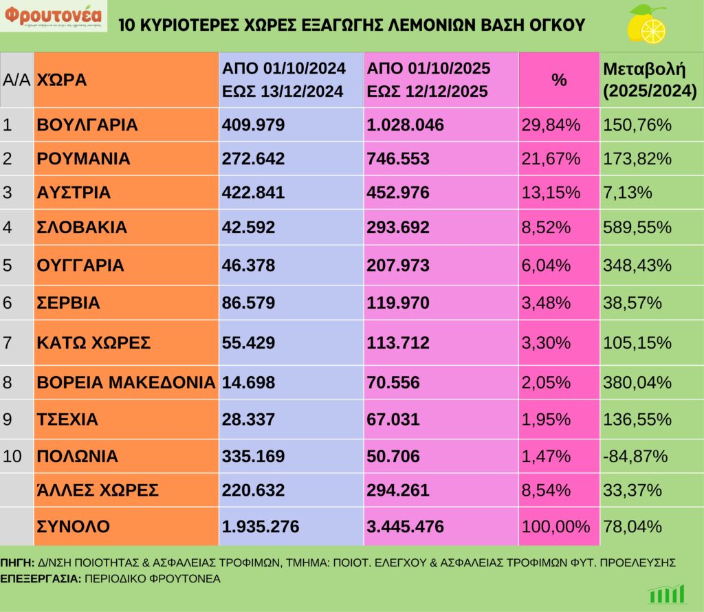 Παρακάτω ακολουθεί ο πίνακας με τις 10 κυριότερες χώρες εξαγωγής λεμονιού βάση όγκου για τις 12.12.25: