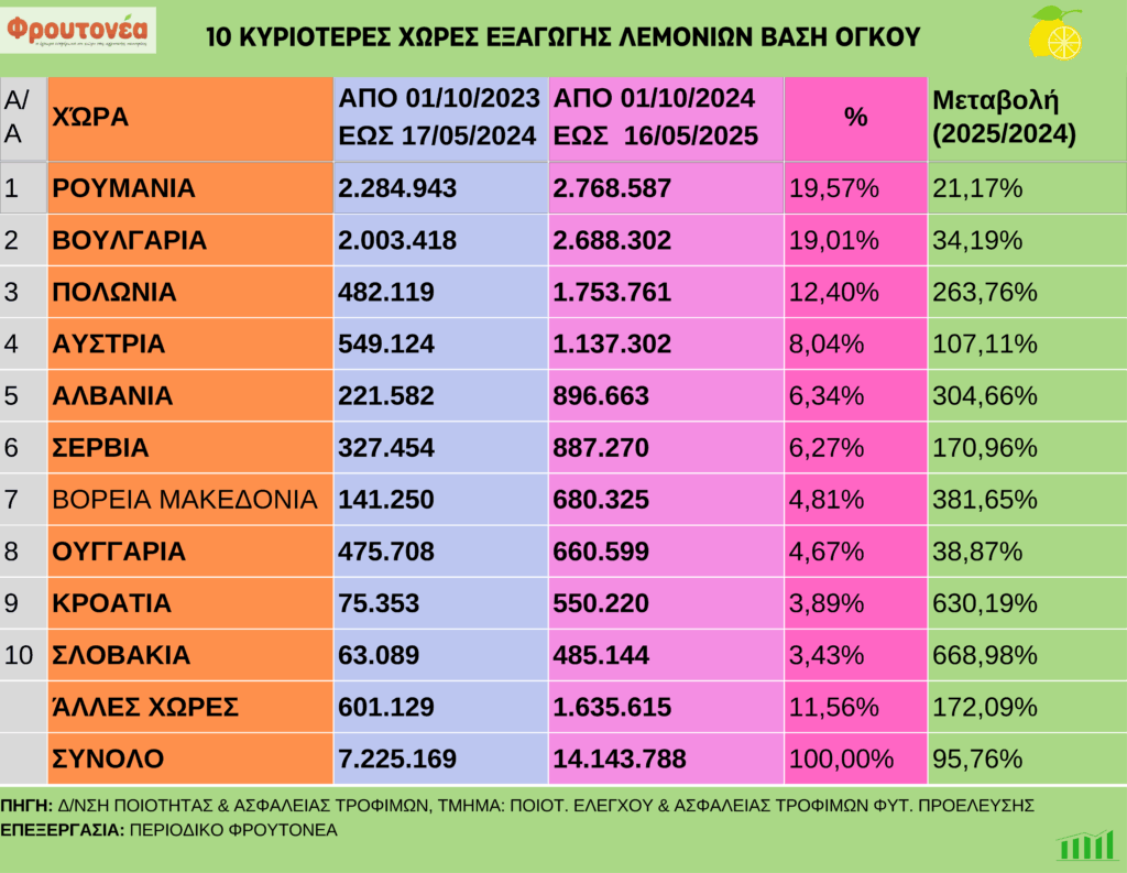 Αυξημένες κατά 95,76% είναι οι εξαγωγές λεμονιών έως και τις 16.5.25 σε σχέση με το αντίστοιχο χρονικό διάστημα πέρυσι. Στις κύριες χώρες απορρόφησης συγκαταλέγονται η Πολωνία, η Βουλγαρία και η Ρουμανία.