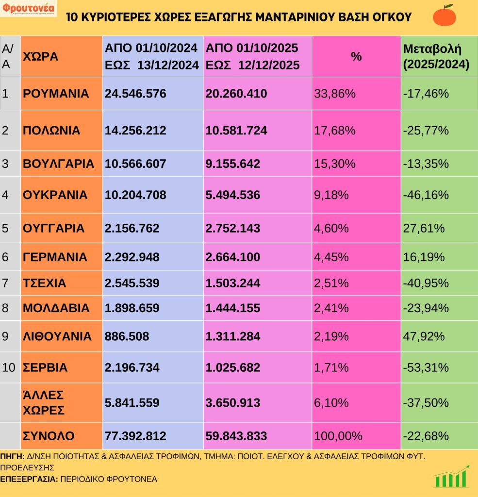 Παρακάτω ακολουθεί ο πίνακας με τις 10 κυριότερες χώρες εξαγωγής μανταρινιού βάση όγκου για τις 12.12.25: