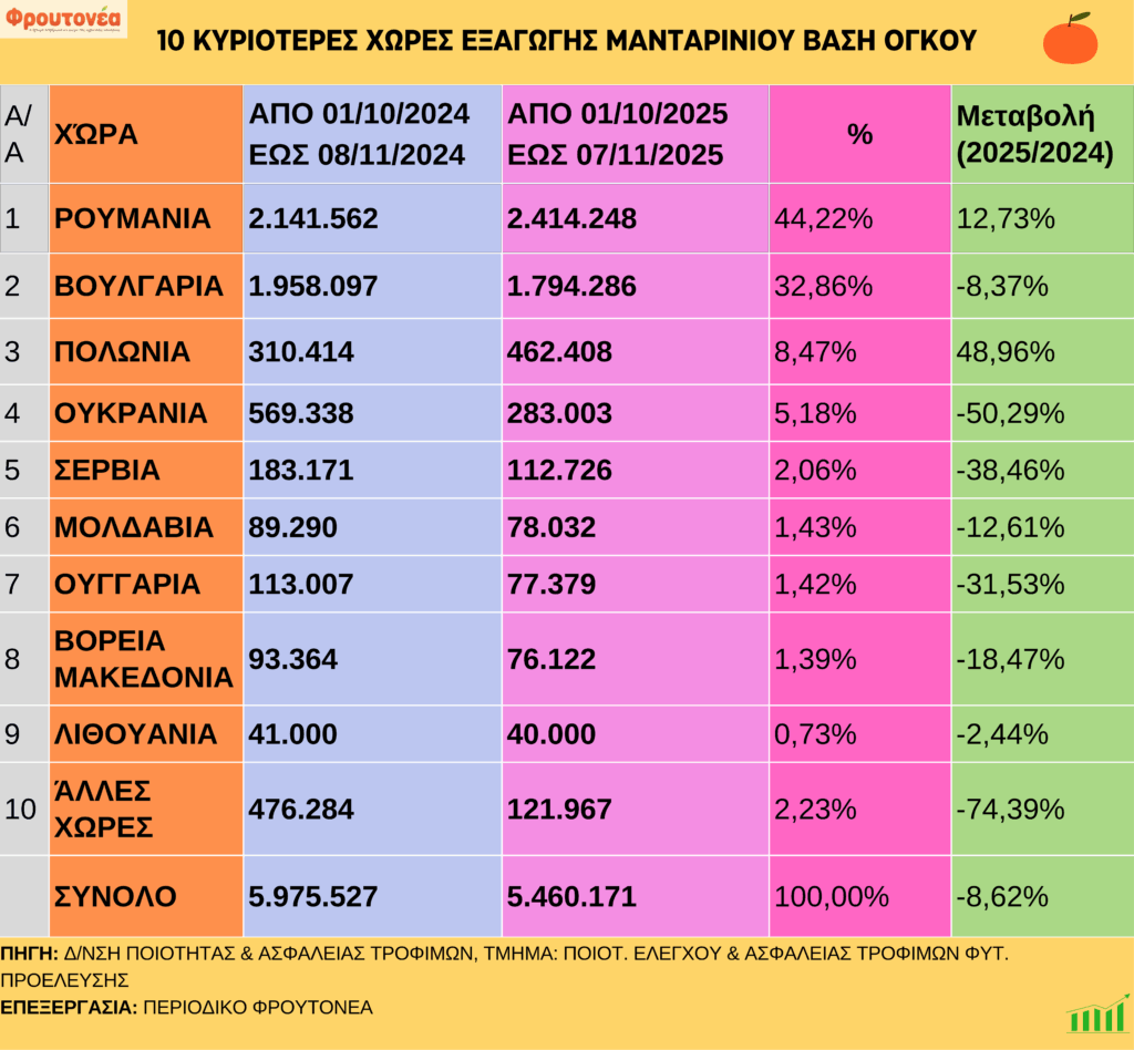 Μανταρίνια: Καθοδικές οι εξαγωγές έως και 7.11.25 10/11/2025 SliderΠορεία προϊόντωνΕσπεριδοειδή FacebookTwitter Με καθοδική πορεία συνεχίστηκαν οι εξαγωγές μανταρινιών έως και 7.11.25, οι οποίες είναι αυξημένες κατά 8,62% σε σχέση με την αντίστοιχη περσινή περίοδο. Tags:ΕξαγωγεςΜΑΝΤΑΡΙΝΙΑ μερίδιο FacebookTwitter Διαβάστε επίσης GLOBALPACK- FOODTECH 2025: Πάνω από 15.600 επαγγελματίες ανακάλυψαν το μέλλον της παραγωγής και της συσκευασίας Μανταρίνια: Καθοδικές οι εξαγωγές έως και 14.11.25 Πορτοκάλια: Καθοδικές οι εξαγωγές έως και 14.11.25 Ακτινίδια: Μειωμένες οι εξαγωγές έως και 14.11.25 Ανάπτυξη του franchise της ΑΒ Βασιλόπουλος έως το 2028 Προηγούμενο άρθροΠορτοκάλια: Καθοδικές οι εξαγωγές έως και 07.11.25Επόμενο άρθροΚαθοδικές οι εξαγωγές μήλων έως και 7.11.25 Σχετικά Άρθρα GLOBALPACK- FOODTECH 2025: Πάνω από 15.600 επαγγελματίες ανακάλυψαν το μέλλον της παραγωγής και της συσκευασίας Μανταρίνια: Καθοδικές οι εξαγωγές έως και 14.11.25 Πορτοκάλια: Καθοδικές οι εξαγωγές έως και 14.11.25 Ακτινίδια: Μειωμένες οι εξαγωγές έως και 14.11.25