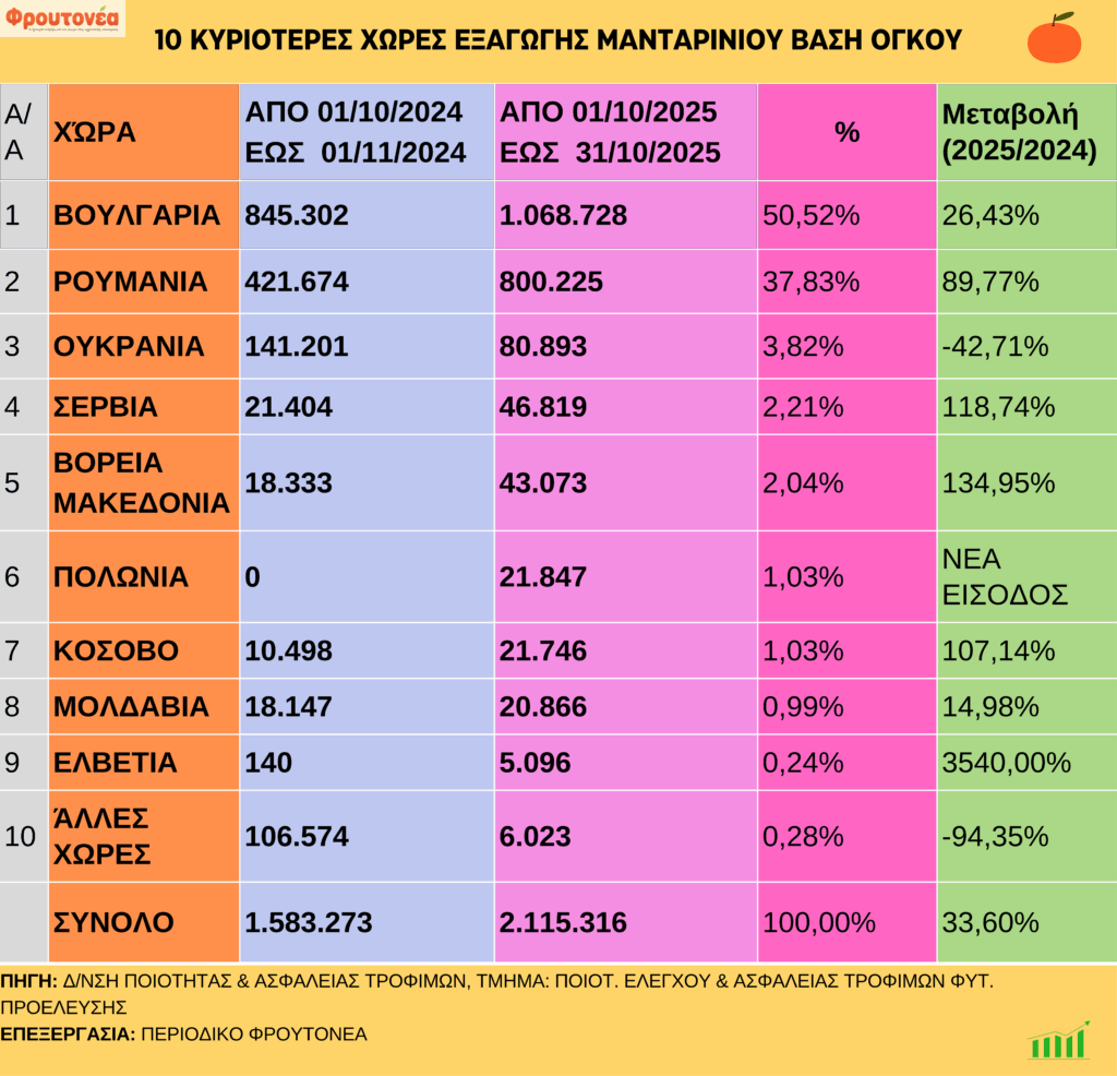 Με ανοδική πορεία συνεχίστηκαν οι εξαγωγές μανταρινιών έως και 31.10.25, οι οποίες είναι αυξημένες κατά 33,60% σε σχέση με την αντίστοιχη περσινή περίοδο.