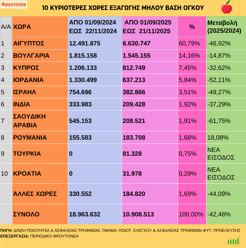 Καθοδικές οι εξαγωγές μήλων έως και 21.11.25 21/11/2025 SliderΠορεία προϊόντωνΜηλοειδή FacebookTwitter Με καθοδική πορεία συνεχίστηκαν οι εξαγωγές μήλων έως και 21.11.25, οι οποίες είναι μειωμένες κατά 42,48% σε σχέση με την αντίστοιχη περσινή περίοδο. Tags:ΕξαγωγεςΜΗΛΑ μερίδιο FacebookTwitter Διαβάστε επίσης Ολοκληρώθηκε η συνέντευξη τύπου για την FRESKON 2026 Μειωμένη η καλλιέργεια πατάτας στην Ευρώπη Από 21 έως 23 Απριλίου η Macfrut 2026 ΑΑΔΕ: Πληρωμή ύψους 1,4 εκατ. ευρώ για άμεσες ενισχύσεις έτους 2017 Αύξηση 6,6% στις πωλήσεις του 1ου τριμήνου στα σούπερ μάρκετ Με καθοδική πορεία συνεχίστηκαν οι εξαγωγές μήλων έως και 21.11.25, οι οποίες είναι μειωμένες κατά 42,48% σε σχέση με την αντίστοιχη περσινή περίοδο. Tags:ΕξαγωγεςΜΗΛΑ μερίδιο FacebookTwitter Διαβάστε επίσης Ολοκληρώθηκε η συνέντευξη τύπου για την FRESKON 2026 Μειωμένη η καλλιέργεια πατάτας στην Ευρώπη Από 21 έως 23 Απριλίου η Macfrut 2026 ΑΑΔΕ: Πληρωμή ύψους 1,4 εκατ. ευρώ για άμεσες ενισχύσεις έτους 2017 Αύξηση 6,6% στις πωλήσεις του 1ου τριμήνου στα σούπερ μάρκετ Προηγούμενο άρθροΤους στόχους για το 2026 γνωστοποίησε η Ένωση Σούπερ Μάρκετ ΕλλάδαςΕπόμενο άρθροΜανταρίνια: Καθοδικές οι εξαγωγές έως και 21.11.25 Σχετικά Άρθρα Ολοκληρώθηκε η συνέντευξη τύπου για την FRESKON 2026 Μειωμένη η καλλιέργεια πατάτας στην Ευρώπη Από 21 έως 23 Απριλίου η Macfrut 2026 ΑΑΔΕ: Πληρωμή ύψους 1,4 εκατ. ευρώ για άμεσες ενισχύσεις έτους 2017