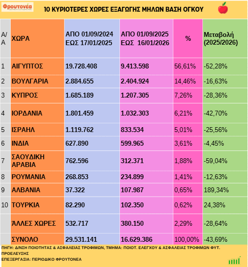 Η μείωση των εξαγωγών μήλου για τις 16.01.2026 αντιστοιχεί στο 43,69% σε σχέση με τις 17.01.2025. Αντιστοίχως σε όγκο: 16.629.386 τόνοι το 2026 έναντι 29.531.141 το 2025.