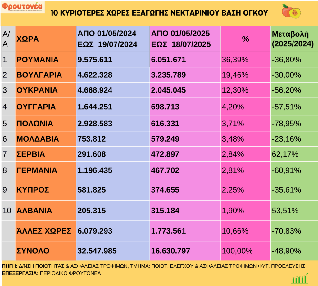 Μειωμένες κατά -48,90% είναι έως και 18.7.25 οι εξαγωγές νεκταρινιού σε σχέση με το αντίστοιχο περσινό διάστημα. Οι κύριες χώρες απορρόφησης με συντριπτικό αριθμό είναι η Βουλγαρία, η Ουκρανία και η Ρουμανία.