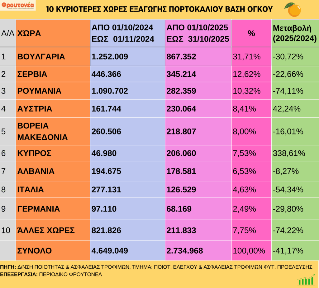 Με καθοδική πορεία συνεχίστηκαν οι εξαγωγές πορτοκαλιών έως και 31.10.25, οι οποίες είναι μειωμένες κατά 41,17% σε σχέση με την αντίστοιχη περσινή περίοδο.