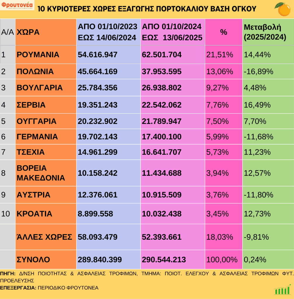 Με ανοδική πορεία συνεχίστηκαν οι εξαγωγές πορτοκαλιών έως και 13.6.25, οι οποίες είναι αυξημένες κατά 0,24% σε σχέση με την αντίστοιχη περσινή περίοδο.