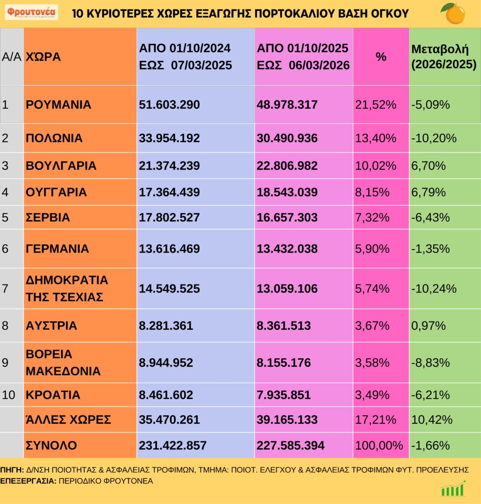 Παρακάτω ακολουθεί ο πίνακας με τις 10 κυριότερες χώρες εξαγωγής πορτοκαλιού βάση όγκου για τις 6.3.26:
