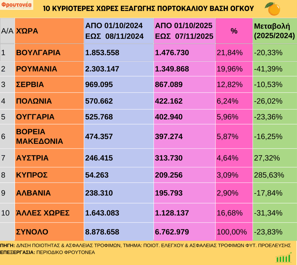 Πορτοκάλια: Καθοδικές οι εξαγωγές έως και 07.11.25 10/11/2025 SliderΠορεία προϊόντωνΕσπεριδοειδή FacebookTwitter Με καθοδική πορεία συνεχίστηκαν οι εξαγωγές πορτοκαλιών έως και 07.11.25, οι οποίες είναι μειωμένες κατά 23,83% σε σχέση με την αντίστοιχη περσινή περίοδο. Tags:ΕξαγωγεςΠΟΡΤΟΚΑΛΙΑ μερίδιο FacebookTwitter Διαβάστε επίσης GLOBALPACK- FOODTECH 2025: Πάνω από 15.600 επαγγελματίες ανακάλυψαν το μέλλον της παραγωγής και της συσκευασίας Μανταρίνια: Καθοδικές οι εξαγωγές έως και 14.11.25 Πορτοκάλια: Καθοδικές οι εξαγωγές έως και 14.11.25 Ακτινίδια: Μειωμένες οι εξαγωγές έως και 14.11.25 Ανάπτυξη του franchise της ΑΒ Βασιλόπουλος έως το 2028 Προηγούμενο άρθροΑκτινίδια: Μειωμένες οι εξαγωγές έως και 7.11.25Επόμενο άρθροΜανταρίνια: Καθοδικές οι εξαγωγές έως και 7.11.25 Σχετικά Άρθρα GLOBALPACK- FOODTECH 2025: Πάνω από 15.600 επαγγελματίες ανακάλυψαν το μέλλον της παραγωγής και της συσκευασίας Μανταρίνια: Καθοδικές οι εξαγωγές έως και 14.11.25 Πορτοκάλια: Καθοδικές οι εξαγωγές έως και 14.11.25 Ακτινίδια: Μειωμένες οι εξαγωγές έως και 14.11.25