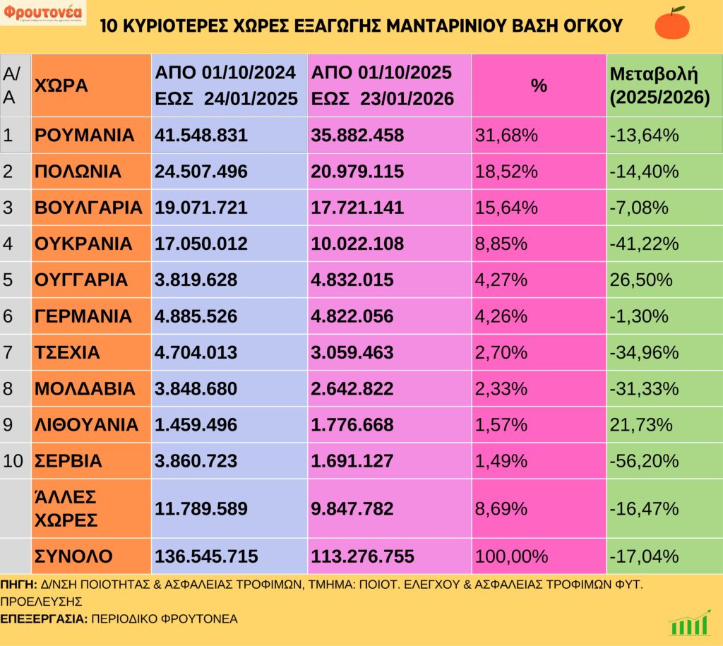 Παρομοίως, από την 52η εβδομάδα του 2025 (26.11.25) μέχρι την τέταρτη εβδομάδα του 2026 (23.1.26), το ποσοστό αύξησης των εξαγωγών είναι πολύ υψηλό (30.221.390 τόνοι στις 26.11.25 και 113.276.755 στις 23.1.26).