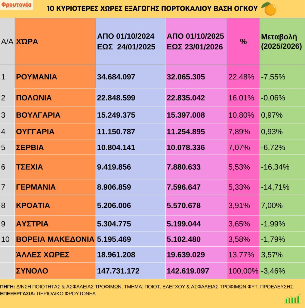 Ελαφρώς βελτιωμένη εμφανίζεται η εικόνα των εξαγωγών πορτοκαλιών κατά την τέταρτη εβδομάδα του έτους, σε σύγκριση με τους τελευταίους μήνες του 2025. Αν και σε σύγκριση με την αντίστοιχη περσινή περίοδο όπου οι εξαγωγές εξακολουθούν να κινούνται σε χαμηλότερα επίπεδα, η σταδιακή ανάκαμψη είναι εμφανής.