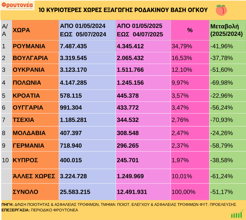 Μειωμένες κατά 51,17% είναι έως και 4.7.25 οι εξαγωγές ροδάκινου σε σχέση με το αντίστοιχο περσινό διάστημα. Οι κύριες χώρες απορρόφησης με είναι η Βουλγαρία, η Ουκρανία και η Ρουμανία.