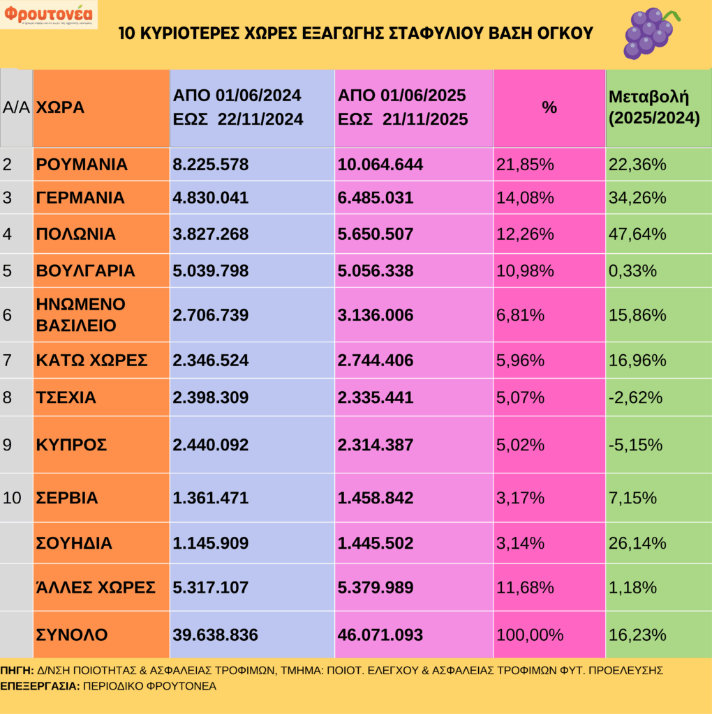 Δείτε αναλυτικά στον παρακάτω πίνακα τα στατιστικά στοιχεία των εξαγωγών σταφυλιού βάση όγκου έως και τις 21.11.25: