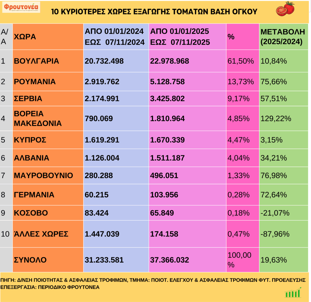 Τομάτες: Ανοδικές οι εξαγωγές έως και 7.11.25 10/11/2025 SliderΠορεία προϊόντωνΤομάτες FacebookTwitter Με ανοδική πορεία συνεχίστηκαν οι εξαγωγές τοματών έως και 07.11.25, οι οποίες είναι αυξημένες κατά 19,63% σε σχέση με την αντίστοιχη περσινή περίοδο. Tags:ΕξαγωγεςΤΟΜΑΤΑ μερίδιο FacebookTwitter Διαβάστε επίσης GLOBALPACK- FOODTECH 2025: Πάνω από 15.600 επαγγελματίες ανακάλυψαν το μέλλον της παραγωγής και της συσκευασίας Μανταρίνια: Καθοδικές οι εξαγωγές έως και 14.11.25 Πορτοκάλια: Καθοδικές οι εξαγωγές έως και 14.11.25 Ακτινίδια: Μειωμένες οι εξαγωγές έως και 14.11.25 Ανάπτυξη του franchise της ΑΒ Βασιλόπουλος έως το 2028 Προηγούμενο άρθροΑγγούρια: Καθοδικές οι εξαγωγές έως και 7.11.25Επόμενο άρθροMetro AEBE: Νέα Γενική Διευθύντρια Marketing η Πόπη Ασλανίδου Σχετικά Άρθρα GLOBALPACK- FOODTECH 2025: Πάνω από 15.600 επαγγελματίες ανακάλυψαν το μέλλον της παραγωγής και της συσκευασίας Μανταρίνια: Καθοδικές οι εξαγωγές έως και 14.11.25 Πορτοκάλια: Καθοδικές οι εξαγωγές έως και 14.11.25 Ακτινίδια: Μειωμένες οι εξαγωγές έως και 14.11.25