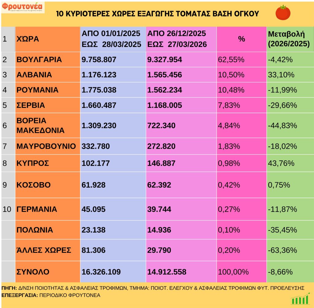 Μετά τη θετική πορεία των προηγούμενων εβδομάδων, η εικόνα των εξαγωγών τομάτας παρουσίασε κάμψη κατά τη 13η εβδομάδα του έτους (έως 27.03.2026). Παρά την οριακή άνοδο που καταγραφόταν έως και τη 12η εβδομάδα, τα τελευταία στοιχεία δείχνουν σημαντική υποχώρηση των όγκων συγκριτικά με το αντίστοιχο περσινό διάστημα.