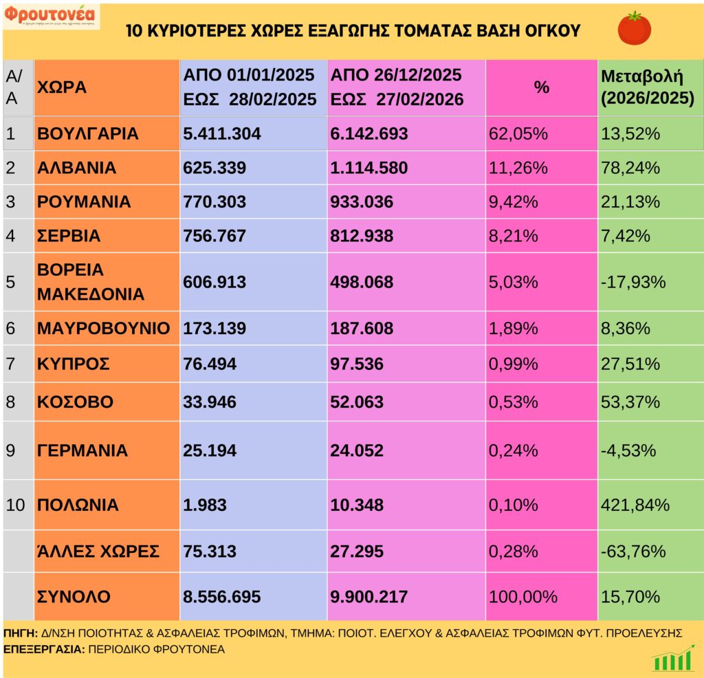 Τομάτες: Σταθερά ανοδικές οι εξαγωγές έως και 27.2.26
